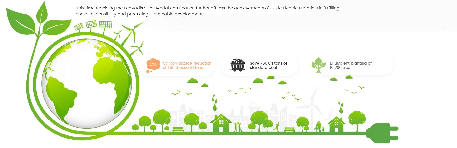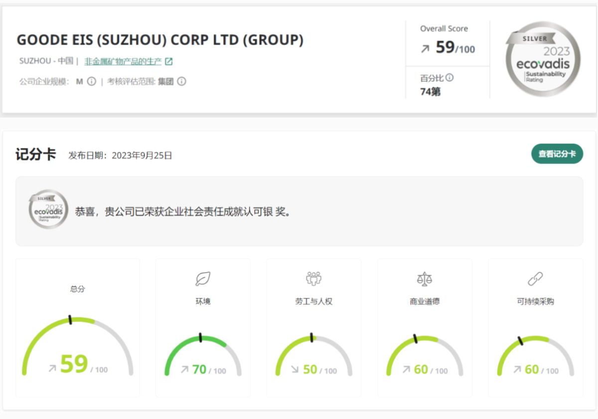 Son zamanlarda Goode EIS (Suzhou) Corp LTD. (Goode Electrical Materials), 2023 Ecovadis sürdürülebilirlik sertifikasyon derecelendirmesinde 59 puan alarak gümüş madalya kazandı ve küresel değerlendirmeye katılan 85.000 işletme arasında %26'lık sıralamada ve Çin'de ilk %8'lik dilimde yer aldı.